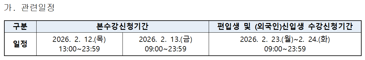 2026학년도 신입생, 편입생 수강신청 관련 안내